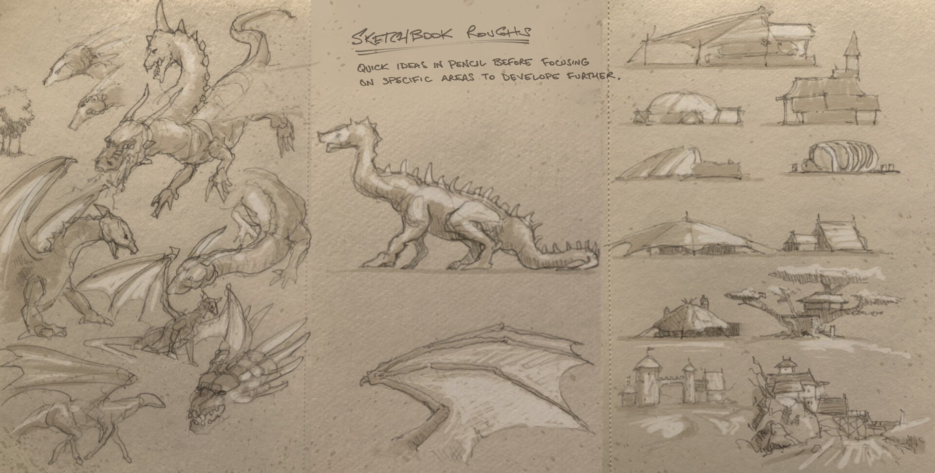 This is not for the game but I recently applied for a concept role and when doing a little research into Dragonwilds I was inspired to quickly create some fantasy concepts. I did a few thumnails in my sketchbook before I made a quick 3D model to help find a nice composition and play with the lighting. Finally did a rough paint over. It's been a fun little personal project over the last few days.